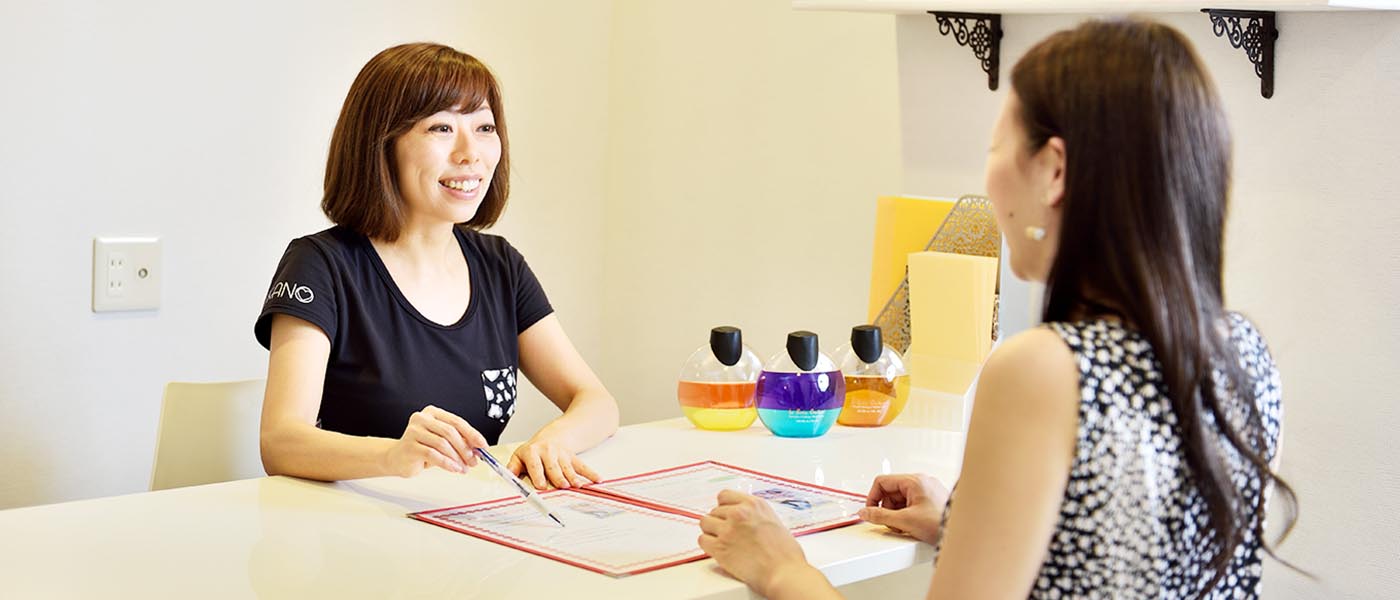 お客様一人ひとり、お食事の内容、嗜好、食べ方、生活習慣、お悩みや気になることなど、たくさんお聞かせ頂き、目標に向けて、負担なく継続できることをアドバイスします。